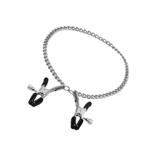Dieses elegante Exemplar überzeugt mit einem schicken Kettendesign. Die gummierten Klemmen werden mit Hilfe eines Schiebeverschlusses an Deinen Nippeln befestigt und beliebig eng zugezogen. Für zusätzlichen, leidenschaftlichen Schmerzreiz verfügt dieses Accessoire über eine Intimklemme, die mit einer Kette aus feinen, schwarzen Perlen an den Nippelklemmen befestigt ist. Durch leichtes Ziehen werden Deine intimsten Stellen leidenschaftlich stimuliert und intensiv durchblutet - einem heißen Liebesspiel steht so nichts mehr im Weg.